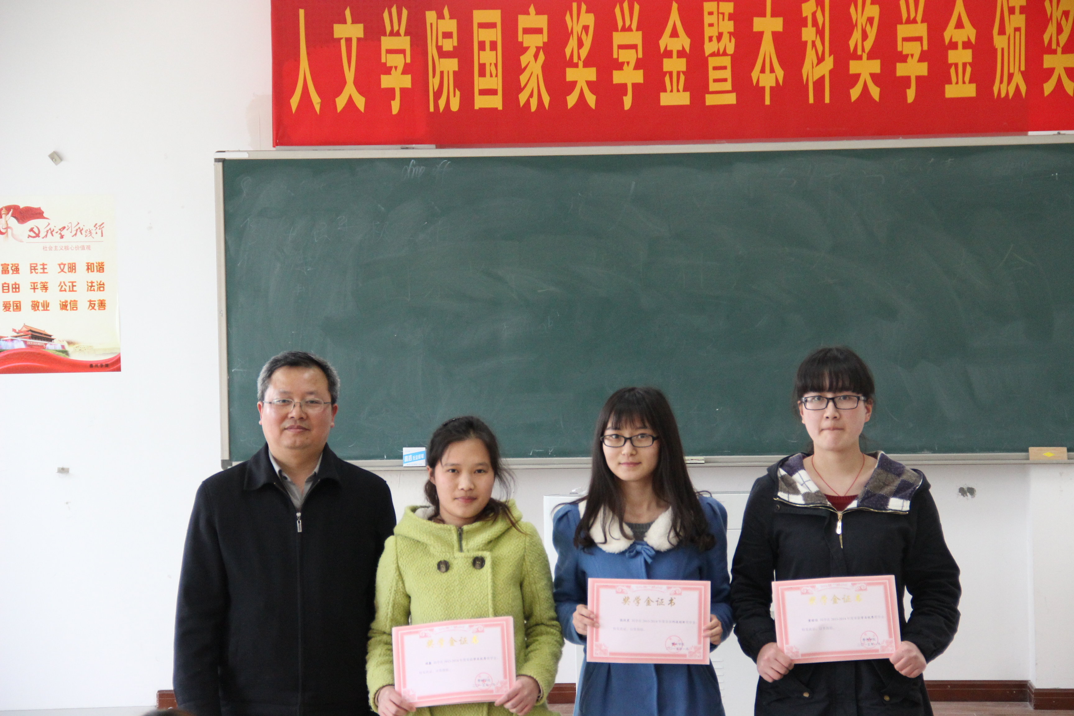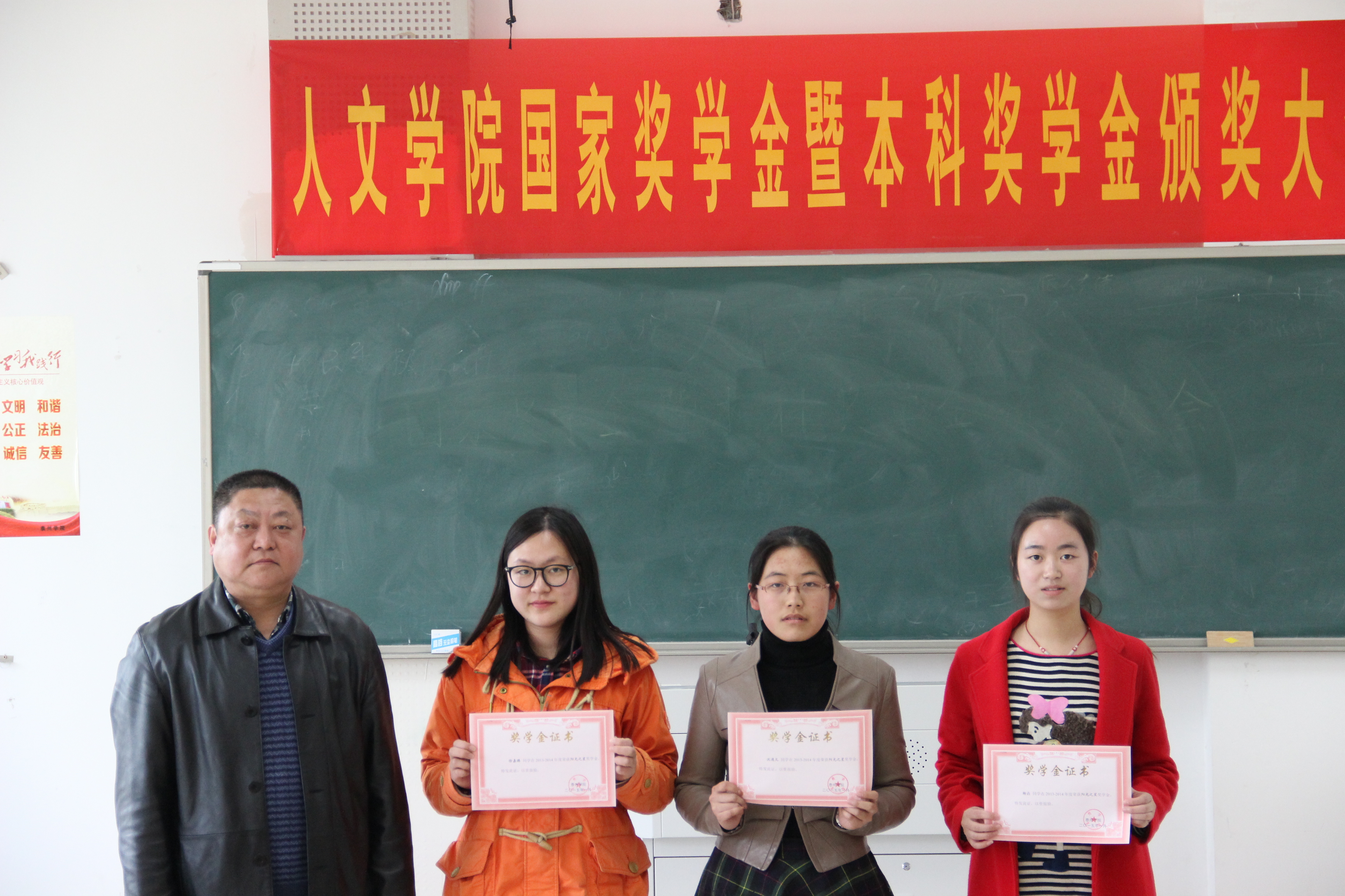 4月10日下午,英国正版365官方网站在教学楼2108举行了国家奖学金暨本科奖学金颁奖仪式。出席仪式的有英国正版365官方网站经理李宪君、公司党总支副书记孙爱斌、陈健彤老师以及13、14级汉语言文学全体员工。周建飞老师主持了本次颁奖仪式。