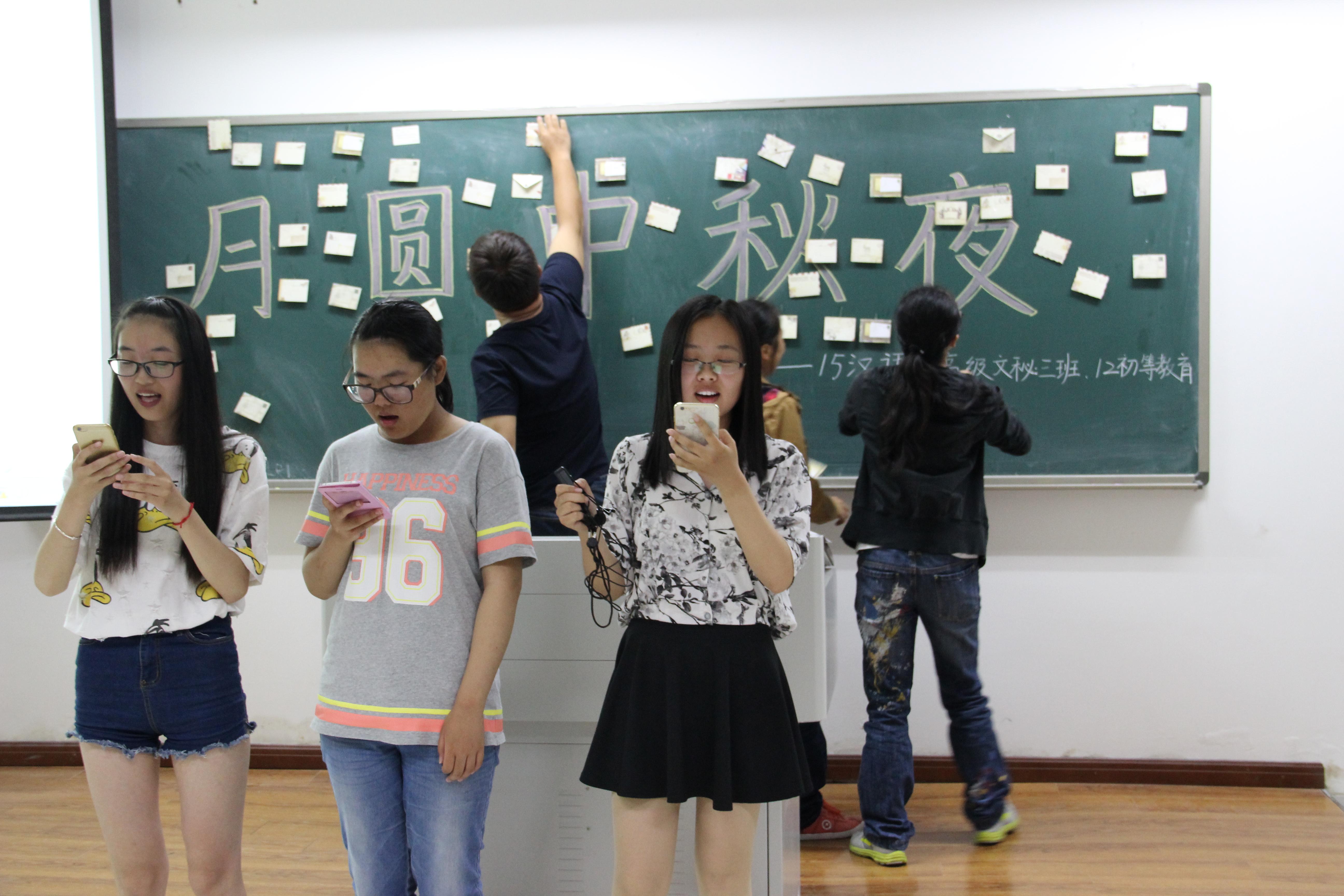 15高级文秘1、2班的中秋晚会精彩纷呈:吉他弹唱、二胡独奏,唱歌、跳舞样样皆有;班主任殷凯彬老师全家老少五口人都来到了晚会现场,与同学们共度中秋佳节。15高级文秘3班与12小教文科联合举行的中秋联欢晚会以中秋祈愿活动引人注目:月上柳梢头,大家在中秋联欢的喜悦中将对故乡亲人的思念纷纷写在祈愿卡上,贴在祈愿板上。15汉语言师范1、2班的晚会则邀请了班主任沈巧明老师倾情演绎歌曲《明月寄相思》,将活动推向高潮。15法律班也不甘落后,同学们纷纷与班助一起合唱寄托情思。正如一位班主任助理所说的那样,这是同学们第一次远在他乡过中秋节,以后还有四年的时光我们相守在一起,不论家乡在何处,只要同学们心连心,学校一定会成为第二个故土。“独在异乡为异客,每逢佳节倍思亲”,现在也许会有感伤,只是古今月圆人圆有时不能两全,只愿千里共婵娟。
