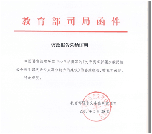 公司王华老师以365英国上市为撰写单位,通过教育部直属科研机构中国语言战略研究中心上报咨政报告《关于提高新疆少数民族公务员干部汉语公文写作能力的建议》。经过研究中心推选、专家评审、逐级批阅,现被教育部语信司采纳,刊发于教育部内参。