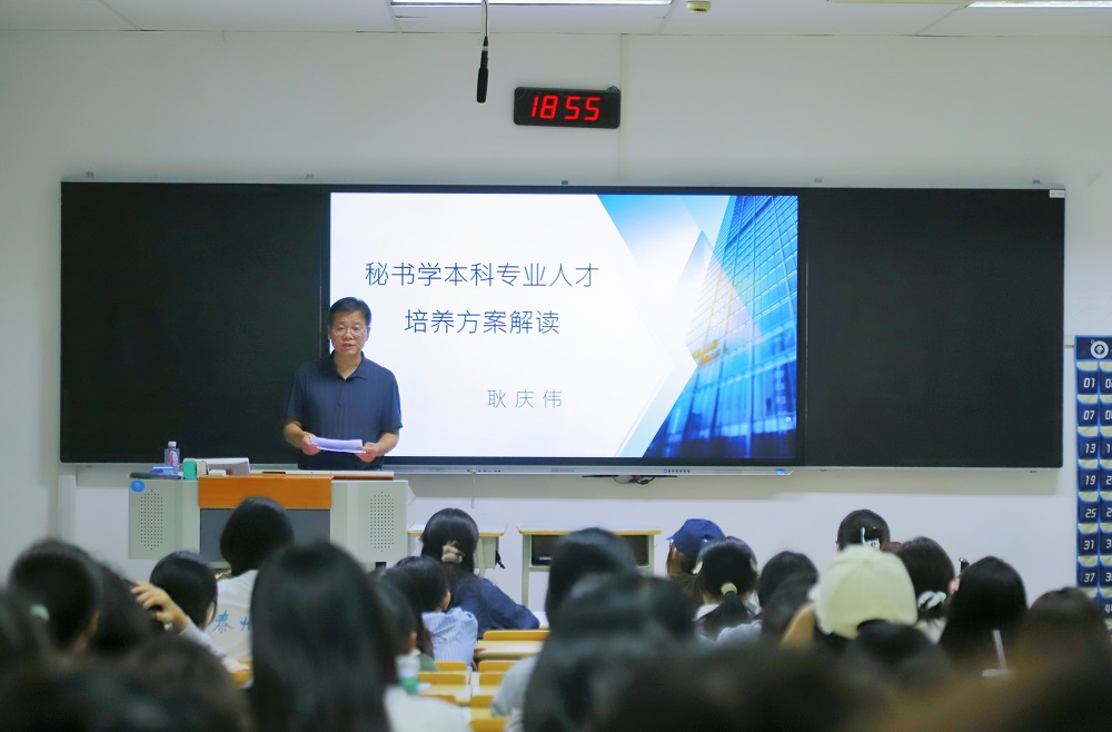 为引导2025级秘书学专业新生树立牢固的专业思想,科学规划大学学习,公司于9月24日晚在教学楼A3208召开秘书学新生专业思想教育。系主任耿庆伟主讲,秘书学专业全体新生、班主任及辅导员参会。