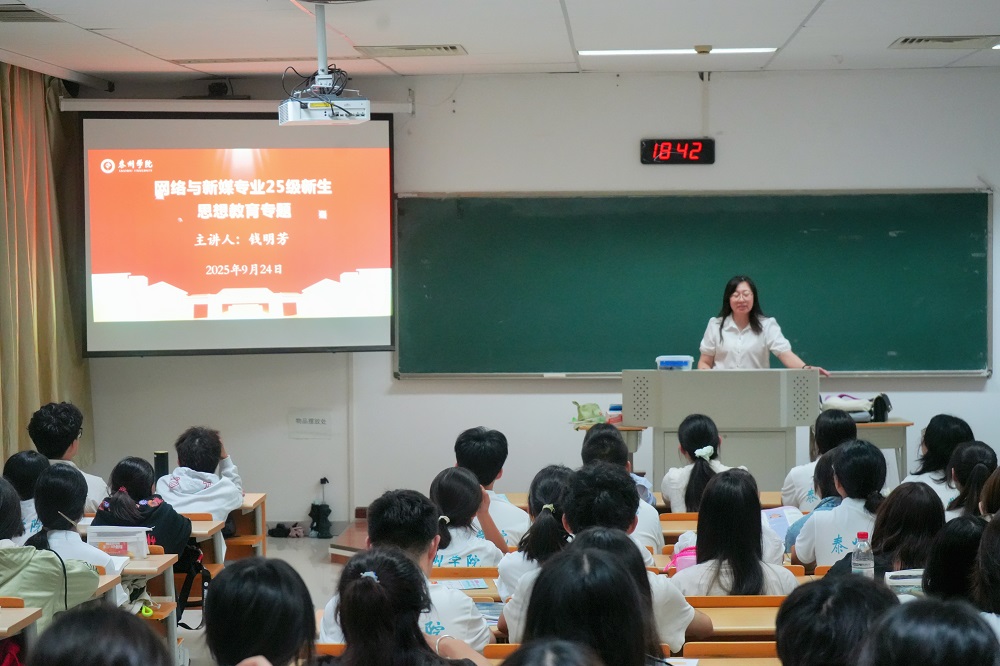 为使2025级网络与新媒体专业新生快速适应专业学习节奏,明晰行业发展前沿,公司于9月24日晚在教学楼A3207举办网络与新媒体新生专业思想教育。系主任钱明芳主讲,网络与新媒体专业全体新生、班主任及辅导员参会。